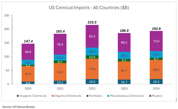 Over the past five years, the United States has imported between $147 billion and $215 billion worth of chemical and related products, with organic chemicals and plastics comprising ~75% of all chemical imports. The American Chemical Society estimates that more than half of these imports go directly into manufacturing. Significant tariffs on these products will translate into higher costs for many US chemical producers.
