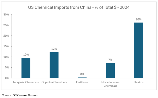 Companies that rely heavily on Chinese imports are particularly exposed, as China has been singled out for some of the highest tariffs. As the chart below shows, China is a major chemical exporter to the US—especially in Plastics.